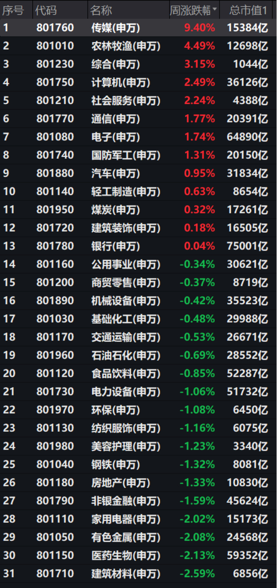 行业表现方面,与Kimi概念密切相关的传媒行业周涨幅达到9.40%。农林渔牧则因为市场博弈猪周期触底反弹全周上涨4.49%。其余上涨行业也与Kimi、低空经济相关。