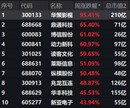 Kimi概念股同样霸榜上周牛股榜单。总市值210亿元的华策影视全周上涨95.41%,连续三天完成涨停。铜连接相关的鼎通科技、兆龙互联、新亚电子等也出现在牛股之列。