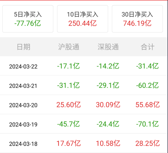 北向上周净流出77.76亿元,除了3月18日周一与3月20日周三,其他三个交易日北向都是净流出。