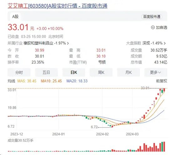 艾艾精工今日涨停,收获15天14板,股价再创历史新高。