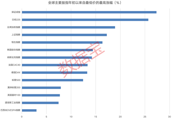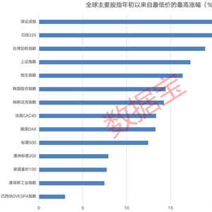 A股主要股指探底回升,反弹幅度领跑全球市场。证券时报·数据宝统计,深证成指自最低点以来最高反弹27.35%,在全球重要指数中居首位;上证指数最高反弹17.27%,排名第四。