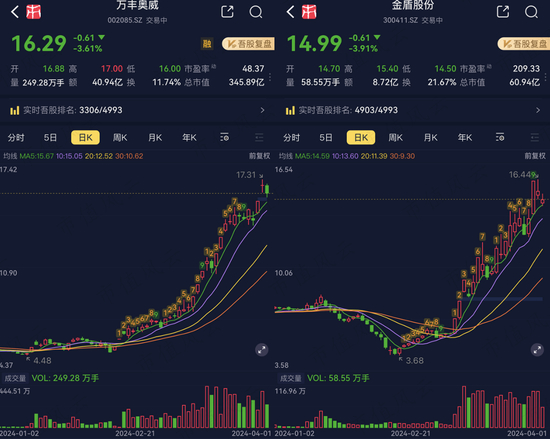 再比如近期反复翻炒的低空经济线,制造端的飞行汽车已经猛涨了快两个月,主板龙头万丰奥威33个交易日大涨260%,创业板龙头金盾股份31个交易日暴涨310%。