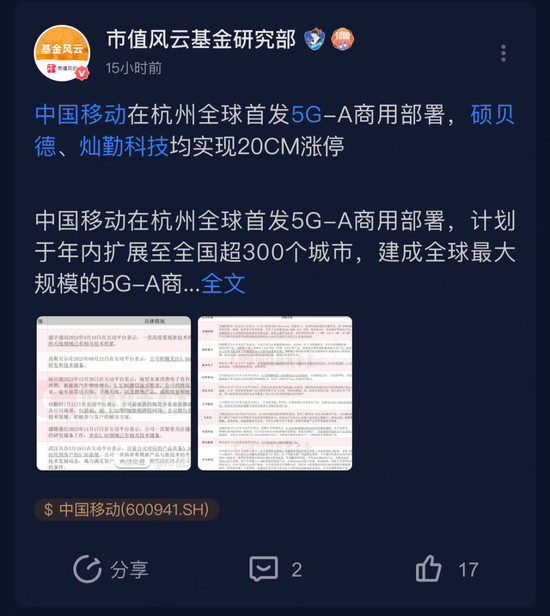 通感一体化又是啥?就是叠加个5G-A的概念,让通信能力可以做到对周边的无人机、汽车等进行探测跟踪。好家伙,恰巧中国移动在星期五还开了个5G-A的会,直接把卫星通信股点燃。