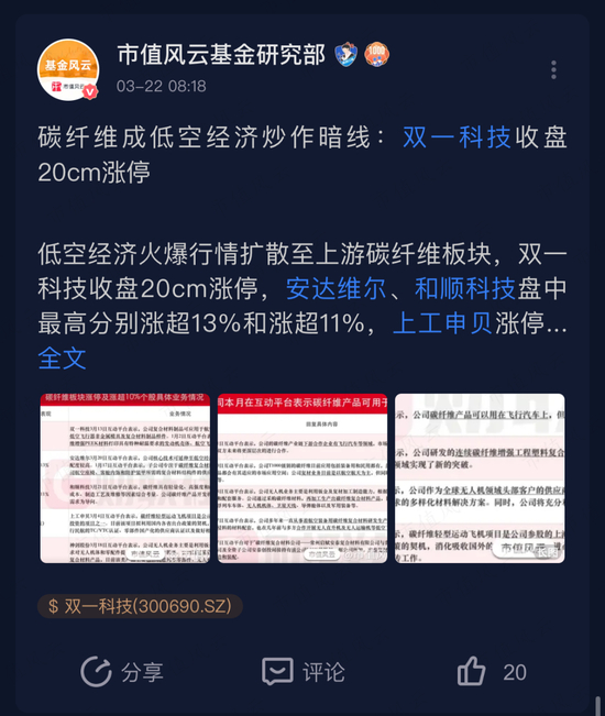 3月下旬随着低空经济概念的延伸和发酵,他立马切入到低空服务碳纤维材料沃尔核材和农业无人机概念股宗申动力。