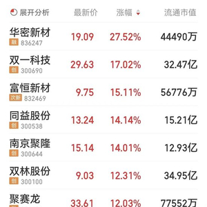 PEEK材料概念表现最火爆,收盘涨幅超过11%。华密新材大涨27.52%,肇民科技收获20cm的涨停板,双一科技、富恒新材、同益股份、聚赛龙、新瀚新材、风光股份涨超10%。
