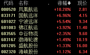 凤凰航运在收盘前一刻钟内直线拉升并涨停,国航远洋、宁波远洋等股跟涨。