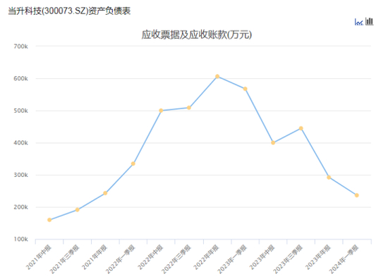 根据一季报数据,当升科技一季度应收账款达23.56亿元。尽管当升科技的应收账款自2022年二季度以来在持续下降,但目前应收账款数额已覆盖一季度营业收入,应收账款占营收比重达115.31%。