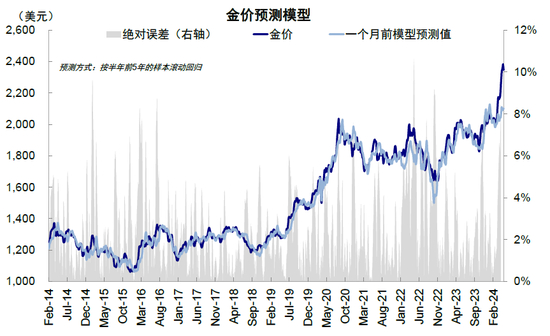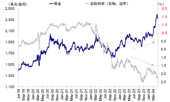 往后看,我们认为目前美债利率4.7%的水平已经基本对应年内不降息,预期较为充分,未来依然有下降空间。我们估计实际利率1.5%-2%(名义利率中枢扣减2~2.5%通胀预期)、美元指数102-106假设下,黄金合理中枢为2400~2500美元/盎司。根据我们在《美联储降息的门槛》和《美股回调有助于降息交易重启》中的分析,降息交易的重启需要以美股和美国信用债适度下跌为前提(我们测算标普500指数跌至4700点和信用利差走阔50bp可以完成“任务”),现在越不预期降息反而越有可能促成降息交易重启,静态看对应三季度。因此,降息交易重启后黄金仍有一波降息交易空间,直到降息开始一两次后结束。