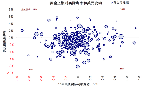 图表3:大多数情况黄金与利率、美元反向变动,三者同涨的情况占比17.5%
