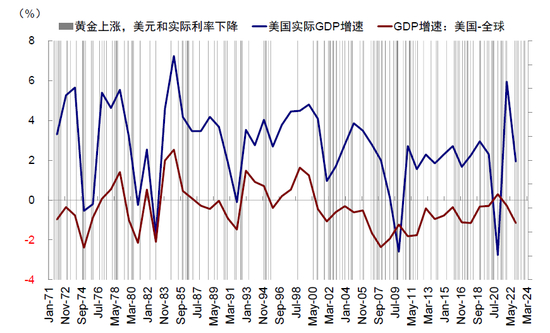 图表5:黄金强、利率降、美元弱,这种情形出现的密集期大多美国经济增速弱于全球