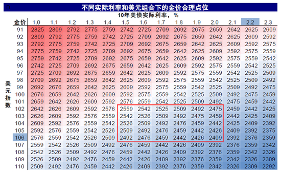图表12:我们估计实际利率1.5%-2%、美元指数102-106下,黄金合理中枢为2400~2500美元/盎司