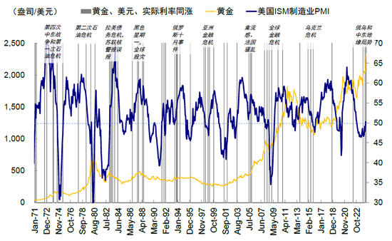 1971年以来,黄金强,并伴随实际利率和美元在月、季度和半年时间范围都走高的频率分别为17.5%、16.0%和11.8%,并不常见。具体来看,这种情况主要发生在突发事件导致的全球避险环境,如1973年第四次中东战争和第一次石油危机、1979年第二次石油危机、1983年拉美债务危机[1]、1987年黑色星期一与股市大跌、1993年俄罗斯十月事件[2]、1998年亚洲金融危机、2005年禽流感和法国动乱[3]、2007年全球金融危机、2014年乌克兰危机[4]及近期地缘局势升温。总结来看,这种情况发生同时通常会伴随一些风险事件,主要为地缘风险和金融风险,除了70年代的两次石油危机、全球金融危机等情况之外,大多数所需避险的风险来源于外部,美国经济本身并未有太强的下行压力。从数据看,美国制造业PMI这些阶段大多也处于上升区间。