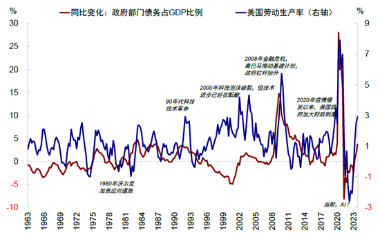 1) 从美国主权债务信用看,偿付压力确实存在,但也不宜过度线性外推。2020年以后,美国大举货币和财政政策导致美元大幅扩张,政府债务率再创新高。以政府部门加杠杆的方式保护了私人部门资产负债表,但也导致公共债务压力大幅抬升。当前财政支出中仅利息支出的占比就已经达到了13%。2023年,惠誉以“政府债务负担高且不断增加”为由下调美国长期信用评级至AA+[5],穆迪将对美国展望从“稳定”下调至“负面”;2024年3月,美国国会预算办公室(CBO)主任Phillip Swagel警告,随着债务上升,美元作为世界储备货币可能受到市场压力[6]。以上都是当前存在的客观事实,但我们认为讨论长期财政和债务稳定性不应该过于静态,还需要同时考虑经济增长的前景。尤其是需要考虑到未来科技进步对经济的拉动可能同时增加财政收入并降低需要的财政支出水平,增强政府的偿债能力。回顾历史,在上世纪90年代互联网科技革命时,美国劳动生产率大幅提升,政府杠杆有了明显的回落。