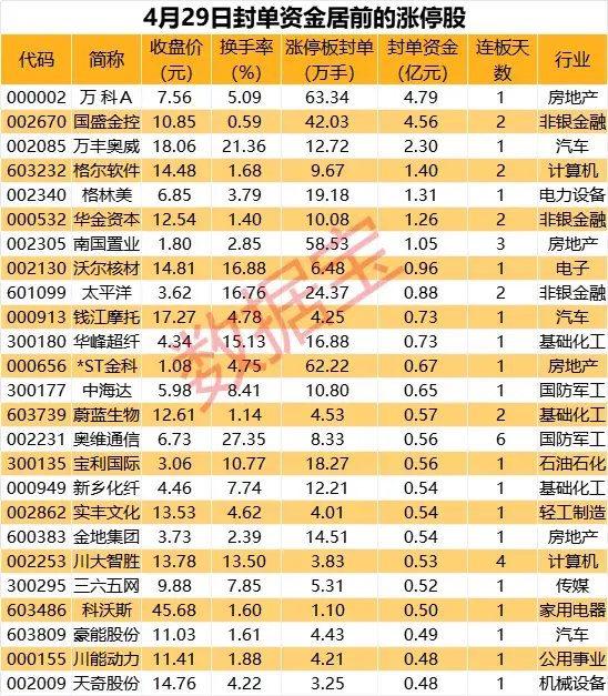 从收盘涨停板封单量来看,万科A封单量最高,有63.34万手;其次是*ST金科、南国置业、国盛金控,涨停板封单分别为62.22万手、58.53万手、42.03万手。