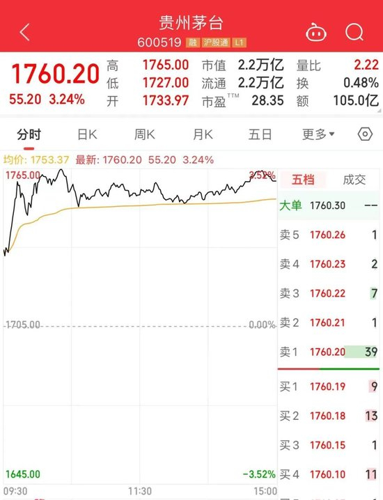 贵州茅台涨逾3%,成交额超100亿元,总市值达2.2万亿元,坐实A股“一哥”。