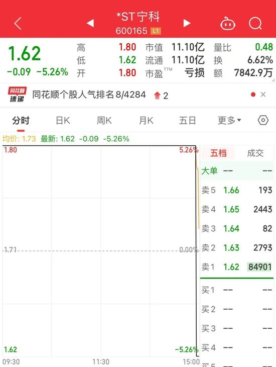 *ST宁科尾盘跳水跌停,走出天地板,成交额超7800万元。