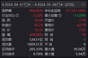 正丹股份尾盘触及20%涨停,成交额超15亿元,刷新历史天量。正丹股份2024年一季度报告显示,公司一季度净利润5899.25万元,同比增长412.94%;营业收入5.18亿元,同比增长28.8%。该股也成为今日同花顺热股榜第一名,有投资者直呼:“这是什么股啊?怎么可以这么牛!”