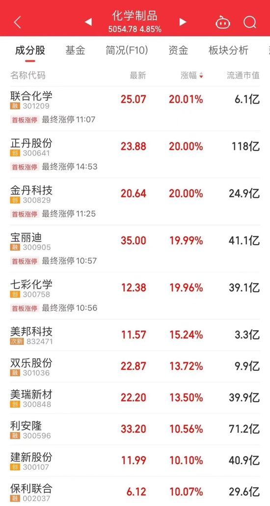 今日,化工板块全线走强。磷化工、印染概念大爆发。联合化学、正丹股份、金丹科技等“20CM”涨停。
