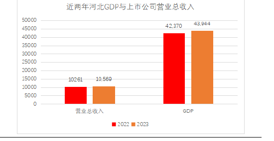 2023河北GDP 约为43944亿元,相较去年同比上涨约3.7%,河北所有上市公司2023财年共实现营业收入10569亿元,相较去年同比上升3%,归母净利润448亿元,相较去年同比上升21%。经济发展与上市公司业绩增长均呈现上升趋势,基本面持续向好,河北上市公司发展前景广阔。