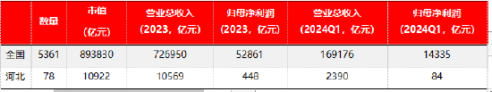 表1:2023/2023 Q1河北与全国上市公司市值、营业总收入、归母净利润
