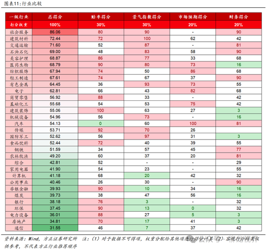 社会服务、建筑材料、交通运输等行业得分较高:社会服务赔率得分、景气指数得分和财务得分较高,总分86.06,在所有一级行业中排首位;建筑材料赔率得分和景气指数得分较高,总分72.44,排名第二;交通运输景气指数得分和财务得分较高,总分71.60,排名第三。