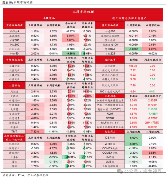 证指数较上周上涨1.60%,沪深300较上周上涨1.72%,中证500较上周上涨1.73%,创业板指较上周上涨1.06%,科创50较上周下跌0.04%。