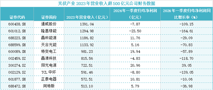A股光伏产业公司业绩在2023年四季度大幅下滑后,2024年一季度延续颓势,光伏头部公司如通威股份(600438.SH)、隆基绿能(601012.SH)在当季甚至录得亏损。