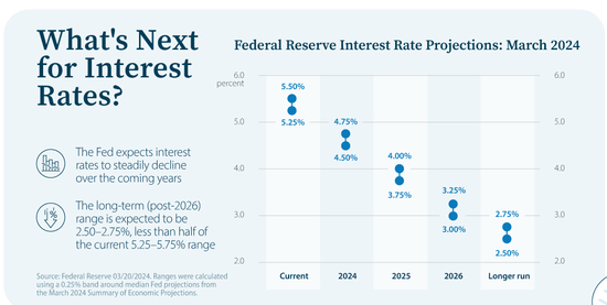 2024年3月,美联储发布了《经济预测摘要》,概述了其对美国利率将在2024年及以后稳步下降的预期。
