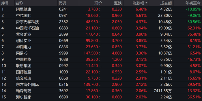 阿里健康涨6.48%,中芯国际涨5.61%,舜宇光学科技涨4.37%,领涨蓝筹。