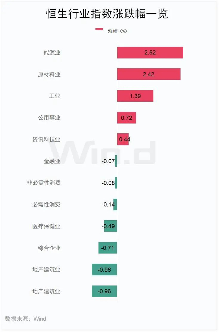 从行业表现看,恒生行业指数日内涨跌不一。能源业指数涨2.52%,原材料业指数涨2.42%,工业指数涨1.39%。跌幅方面,地产建筑业指数跌0.96%,地产建筑业指数跌0.96%,综合企业指数跌0.71%。