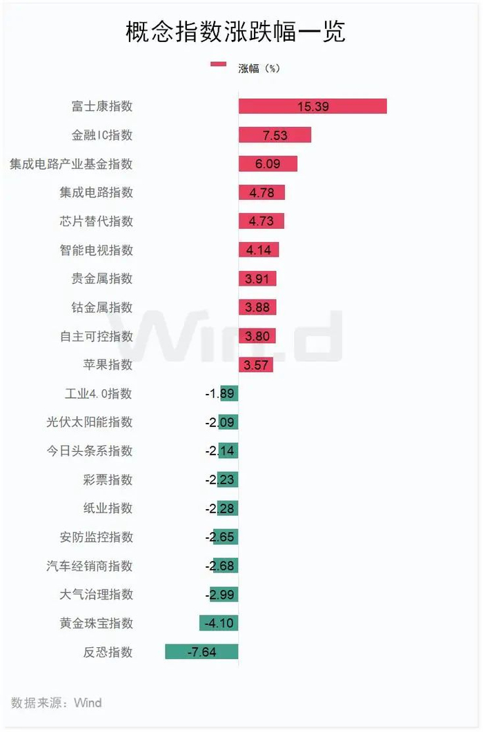 从盘面来看,Wind概念板块多数上涨,富士康指数涨15.39%,金融IC指数涨7.53%,集成电路产业基金指数涨6.09%。跌幅方面,反恐指数领跌7.64%,黄金珠宝指数跌4.1%,大气治理指数跌2.99%。