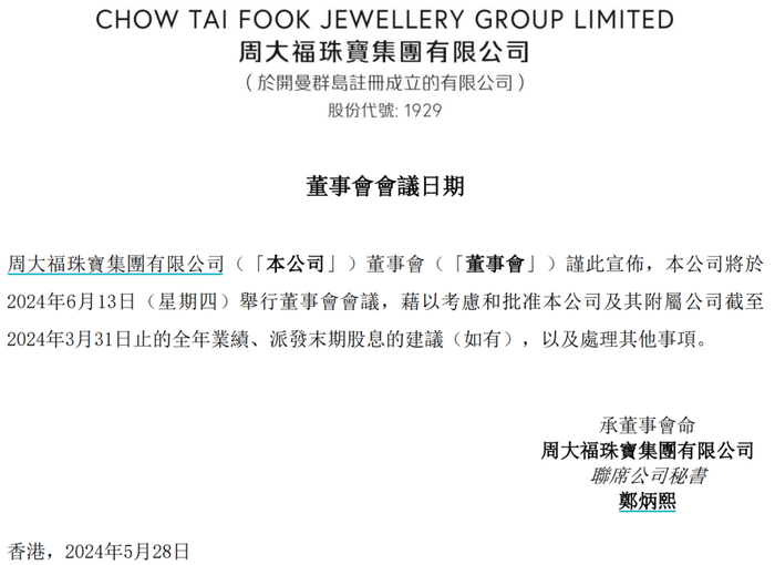 公告显示,周大福计划于6月13日举行董事会,并审议截至2024年3月31日止的全年业绩、派发末期股息的建议。市场普遍关注其2025年度的财政指引及可能的特别股息派送。