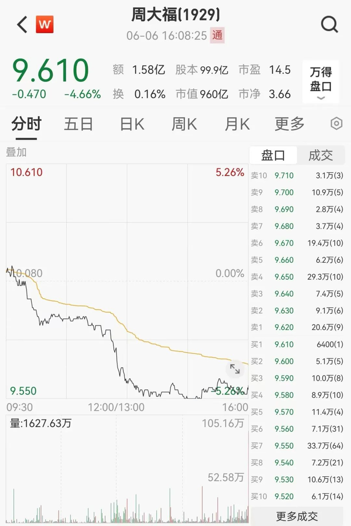 近日,网传周大福深圳工厂停工停产。尽管周大福于6月5日发布声明表示,对深圳厂区部分部门的调整与重新规划不会影响集团业务及对中国内地的长远投资,6月6日周大福股价仍一度大幅下跌5.26%,最终收于9.61港元,跌4.66%。