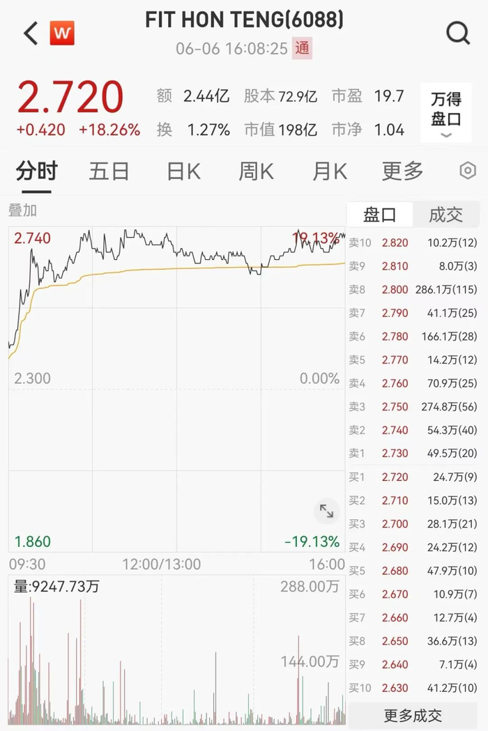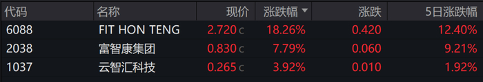 除FIT HON TENG外,另外两只富士康概念股——富智康集团和云智汇科技也分别上涨9.21%和1.92%。