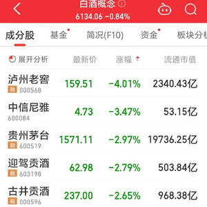 6月11日,白酒股开盘集体重挫,贵州茅台继上周五盘中跳水后,持续走低,盘中一度跌超3%。截至早盘收盘,贵州茅台跌幅有所收窄,跌2.97%,泸州老窖跌超4%,古井贡酒、山西汾酒、五粮液也跌超2%。
