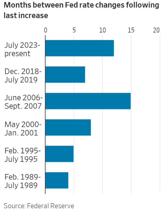 在近35年中,美联储从加息周期过渡到降息周期的时间间隔,只有两次超过12个月。一次是现在,上一次金融危机爆发前夕。