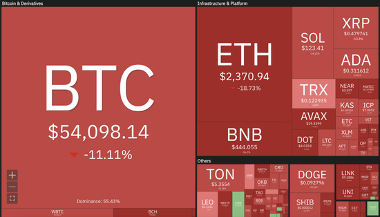 比特币一度跌至54000美元附近,以太坊一度跌至2100美元附近,单日跌幅近20%,24小时爆仓8亿美元,整个加密市场市值跌破2万亿美元。
