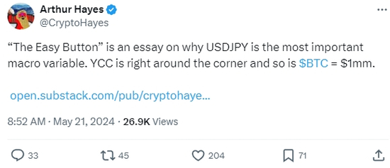 5月份,BitMEX创始人Arthur Hayes 曾经写过一篇文章唱多比特币,认为日元疲软或将比特币推至 100 万美元。