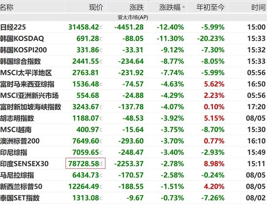 亚太股市跌势有多惨?8月5日,日经225指数下跌12.4%,日经指数期货盘中触发熔断机制,交易一度暂停;中国台湾地区的台湾加权指数跌8.35%;韩国综合指数午后跌幅达8%,一度触发熔断机制,停市20分钟,截至收市跌8.77%;富时新加坡海峡指数跌4.07%;澳洲标普200指数跌3.7%;港股三大指数均收跌,恒生指数跌1.46%。