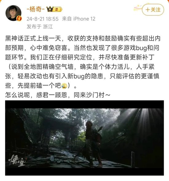 此前,游戏官方还针对玩家指出的“闪退问题”进行回复。此番针对空气墙等问题,游戏科学联合创始人、《黑神话:悟空》艺术总监杨奇8月21日晚表示,游戏上线后团队也发现了很多游戏bug和问题环节,正在准备更新补丁。“我们正在仔细研究定位,并尽快准备更新补丁。说到全地图精确空气墙,确实是个体力活儿,人手紧张,轻易改动也有引入新bug的隐患,只能评估得更谨慎些,先提前磕一个。”