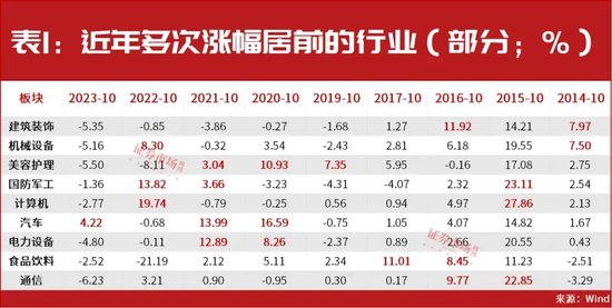 再如家用电器,在2021年、2020年、2019年、2017年的10月涨幅也均进入了前5,其中,2017年10月涨幅最高,超过了10%,海信家电、欧普照明、美的集团等在期间实现领涨;医药生物在2023年、2022年与2017年的10月涨幅也均进入了前5,2022年10月涨幅最高,超过10%,华森制药、众生药业、新天药业等在期间实现领涨。