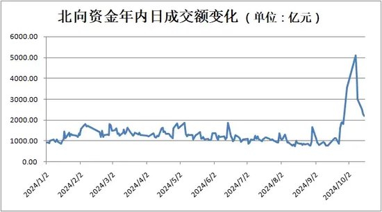 数据显示,北向资金日成交额在今年9月中上旬多数日期都在1000亿元上下波动,处于近年的常规水平。但自9月24日开始,北向资金日成交额大幅增长,当天便增加至1653.15亿元,9月30日更突破3000亿元,达到3569.32亿元。国庆长假后首个交易日,北向资金成交额进一步大幅增加至5101.01亿元,创出历史新高。