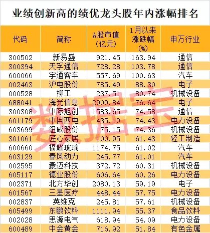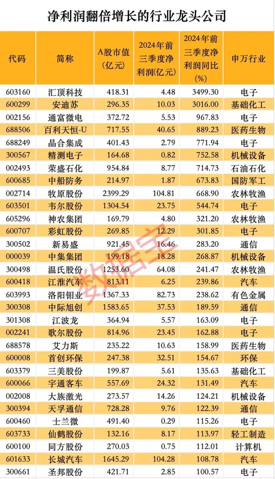 与历史对比来看,据数据宝统计,剔除上市不足两年的公司,共有116家行业龙头公司今年前三季度营收和净利润均同比增长,且创下同期上市以来新高,堪称行业的白马。截至10月30日收盘,这些公司今年以来股价平均上涨23.25%,跑赢同期上证指数13.46个百分点。新易盛、天孚通信、宇通客车年内累计涨幅均在1倍以上,今年前三季度,这3家公司净利润增速分别达到283.2%、122.39%、131.49%。