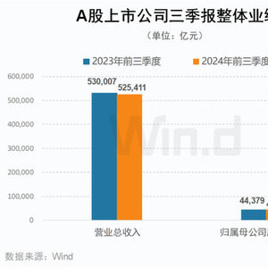 Wind数据显示,截至10月31日凌晨,已完成三季报披露的5356家上市公司前三季度营收合计为52.54万亿元,同比降0.87%;实现归母净利润4.41万亿元,同比降0.53%。第三季度,在金融板块增量的拉动下,A股利润端显著改善,净利润增速较二季度回升6.18个百分点。