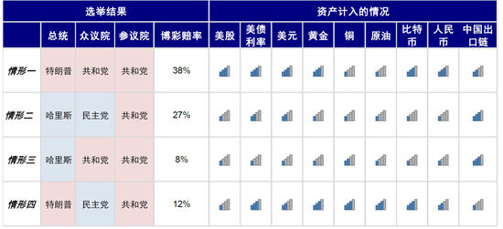 ► “共和党全胜”将强化特朗普政策的推进预期,迫使部分此前还犹豫的投资者快速追高,这意味着特朗普交易整体都还有一定空间,而此前计入预期不多的资产将反应更大。1)美股、美债、美元和比特币,短期仍有冲高可能性,类似2016年的特朗普交易,只不过反弹幅度会比上一轮低。交易到一段时间后,可能会暂缓或逆转(《大选前后的资产表现规律》)。2)相反,铜、原油、中国出口链,则存在需要补偿预期计入不足的风险。铜、油等强周期和资源类风险资产可能在再通胀预期下反弹;基于不确定性避险的黄金反而可能逆转;中国出口链可能边际承压,对美出口占比低+对华进口占比高的行业或具备相对韧性(《大选如何影响中国市场?》)。