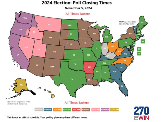 因为时区不同,美国各地的投票站在11月5日当天开启和关闭的时间也不同,一般从东到西依次关闭。比如,最先关闭的投票站包括印第安纳州和肯塔基州的部分地区,关闭时间为美国东部时间11月5日下午6点(对应北京时间6日凌晨6点)。最后一个关闭的州为阿拉斯加,为北京时间6日中午12~下午1点。