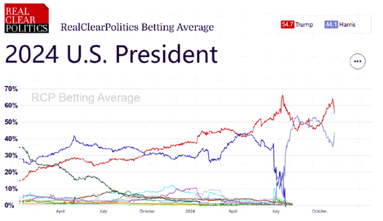 图表:特朗普与哈里斯博彩赔率为54.7% vs. 44.1%,较10月底的63.9%明显收窄