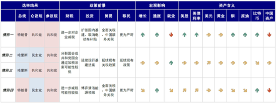 基于此,我们建议的整体交易策略是:1)如果结果比预期的还强,即“共和党全胜”(特朗普总统+共和党掌控参众两院),那当下的“特朗普交易”还会有一段时间和幅度的上冲,但也会随后进入到一段时间等待政策实际兑现的暂缓期,类似于2016年大选后的冲高和2017年1月后的逐步暂缓(《大选前后的资产表现规律》);2)如果结果比预期的低,也即除了“共和党全胜”的其他情形,尤其是哈里斯赢得大选,那就会直接导致所有的交易直接逆转。具体而言,