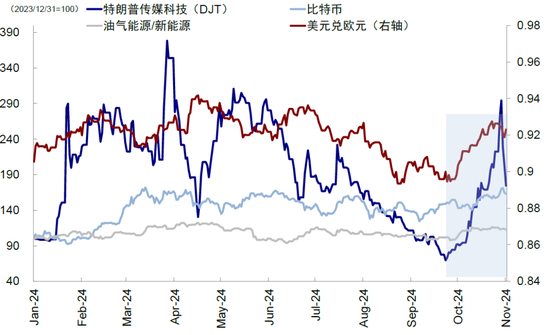 图表:美股、美债、美元、黄金、比特币和人民币汇率对特朗普胜选交易计入的相对较多,但铜、原油和中国出口链股票计入则相对较少