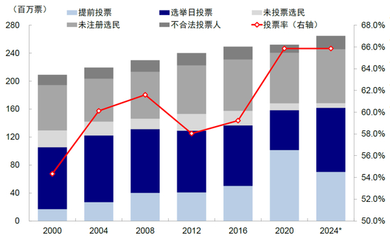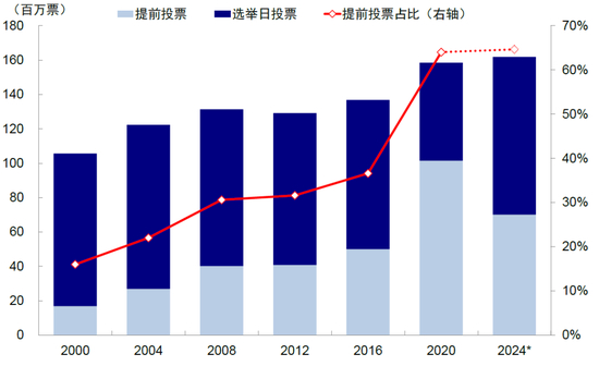 今年提前投票和邮寄选票占比预计依然高达65%。美国有接近1.7亿人的登记选民,2020年大选的投票率约为66%(投票数量占合法投票人口数量),创下一个多世纪以来的最高水平。我们按2024年合法投票人数2.45亿人和2020年投票率66%的预估,2024年的总票数可能达到1.6亿票。截至11月1日,提前投票(early vote)有7000万票(包括现场投票和邮寄),占总票数的43%,如果加上尚未返还的邮寄选票(但这部分选票不一定完全返还),提前投票数或可以达到1亿,占预估总票数的65%。2020和2016年大选提前投票的占比分别为64%和36.6%,今年依然处于较高水平。